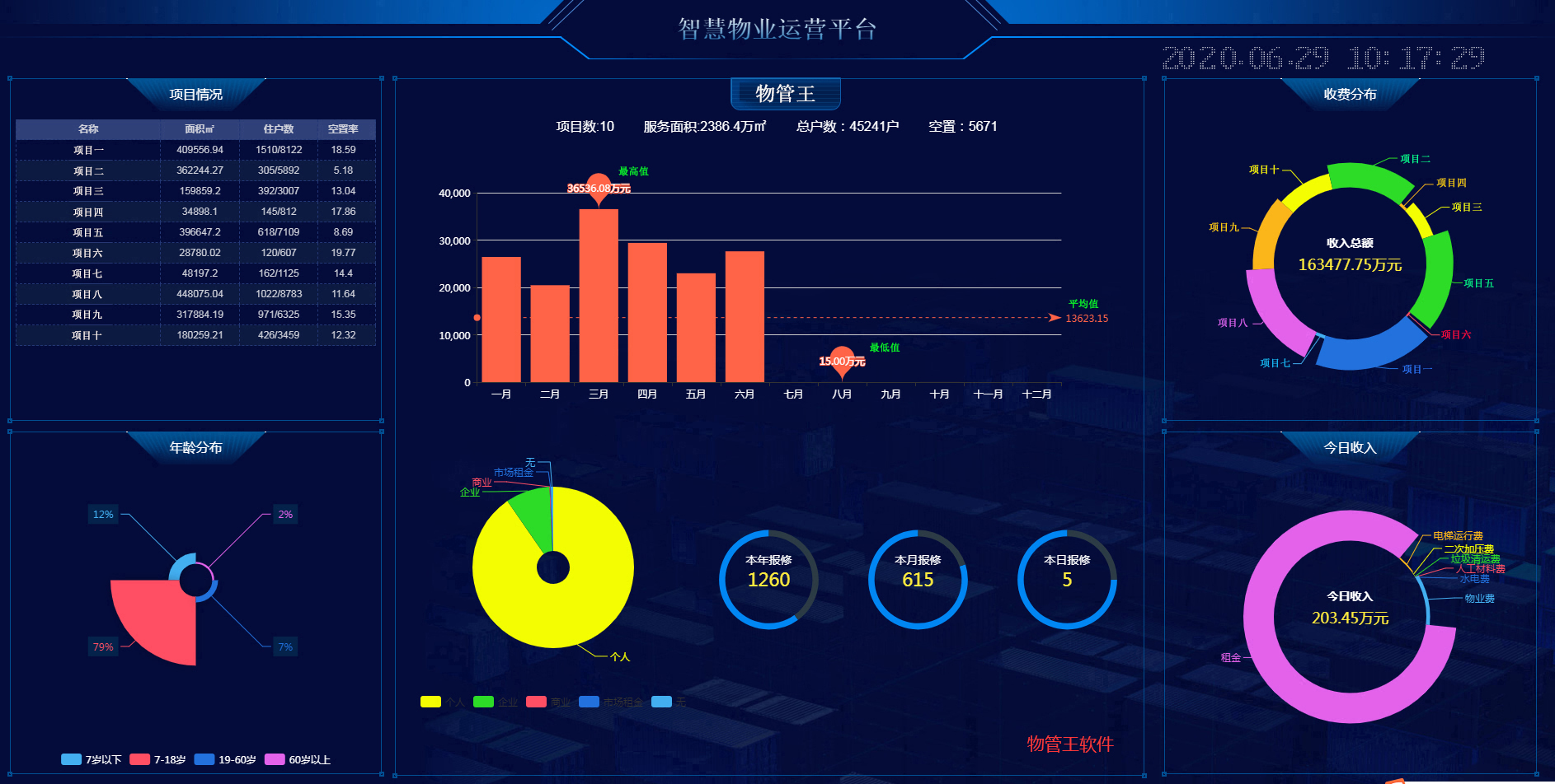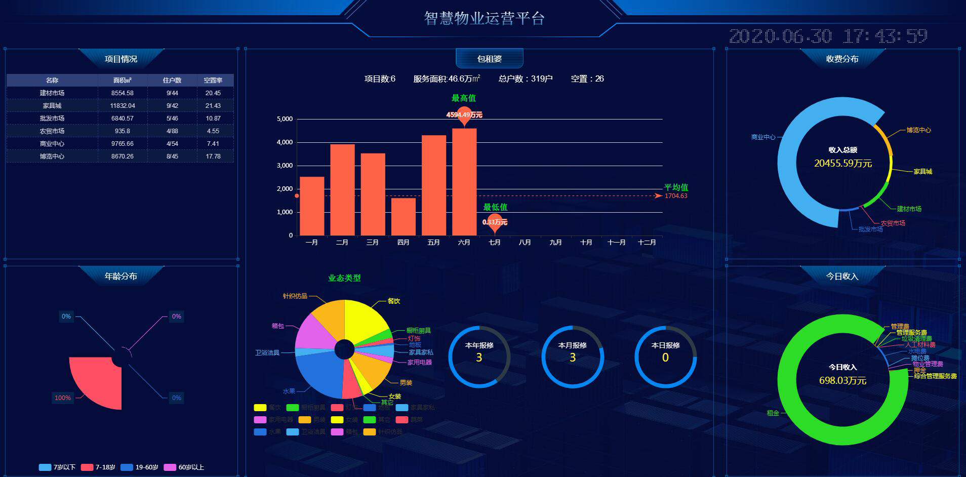 针对于多项目、多业态类型的管理,可以通过大数据展示平台来实现信息化和统一化管理。大数据展示平台可以清晰直观地呈现各项目、各业态的资源使用情况、日收费数据、月收费数据、年收费数据、经营业态类型、业主年龄层分布人群、年月日的报修情况等各项数据,便于对项目和业态的运行情况进行了解和监管。