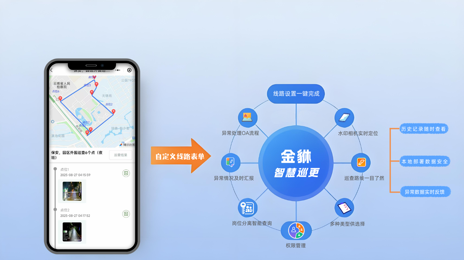 包含功能:巡逻排版、电子巡更、水印拍照、巡逻线路地图化、巡更日志查询、巡查拍照、异常事项拍照上报、异常事项处理、报表统计分析、巡查线路报表统计、异常事项月报统计、异常明细处理日志等