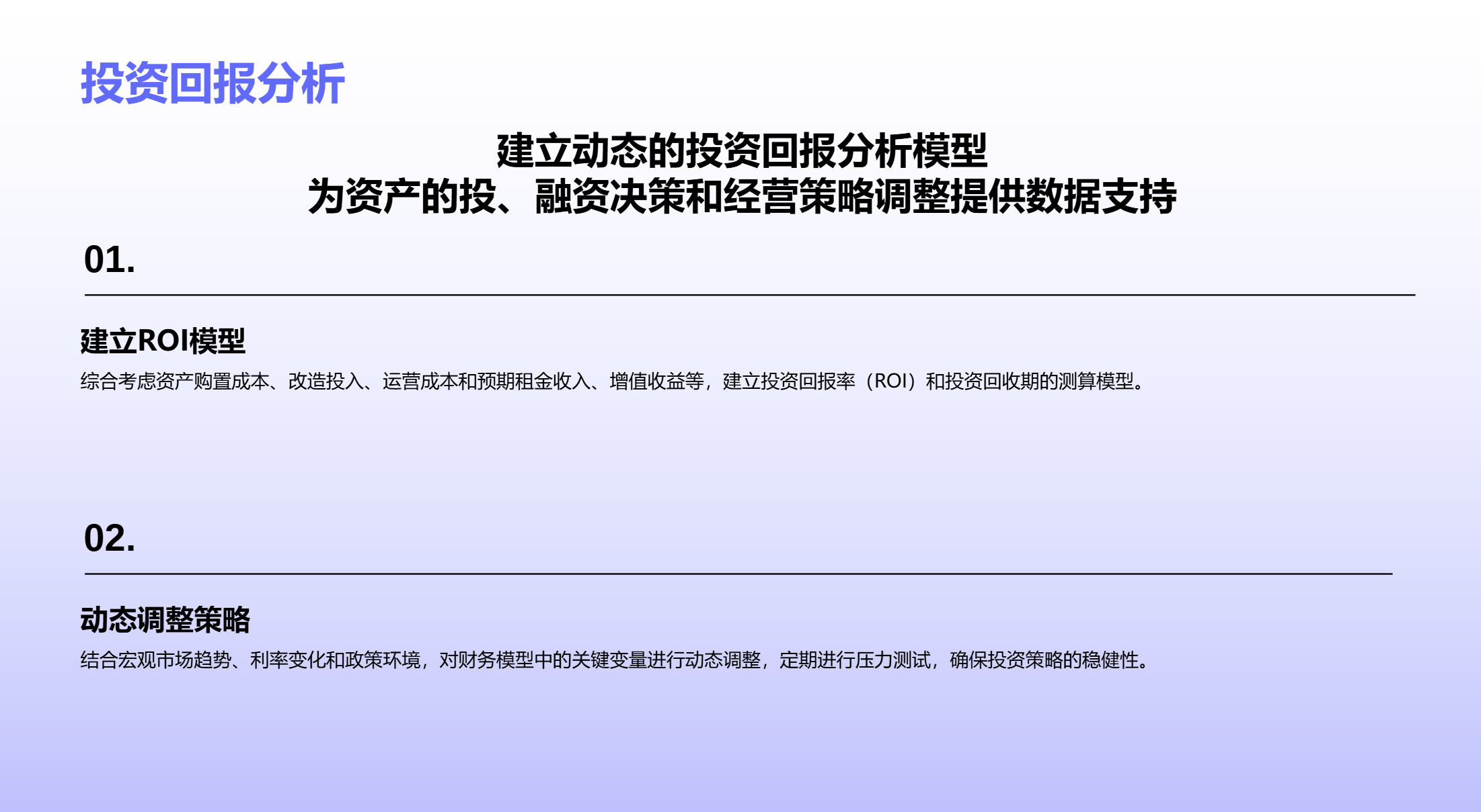 建立科学的投资回报分析模型,对写字楼资产的投资回报进行全面评估和预测。投资回报分析主要包括租金收益、增值服务收益、资产增值收益等方面,通过分析写字楼的出租率、租金水平、运营成本、资产增值潜力等因素,预测投资回报率、投资回收周期等核心指标。同时,结合市场趋势和政策环境,对投资回报进行动态调整和优化,为投资决策提供数据支撑。例如,通过CLV/CAC模型评估租户价值,优先选择高价值租户,提升投资回报;通过分析智慧化、绿色化改造的投入与产出,合理安排投资计划,确保投资回报最大化。此外,加强投资回报的跟踪监测,及时发现投资过程中的问题,调整投资策略,确保投资目标的实现。