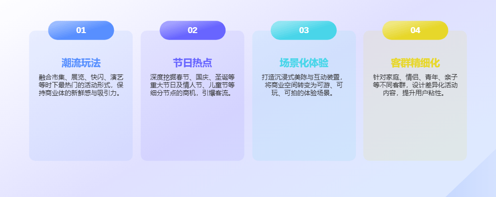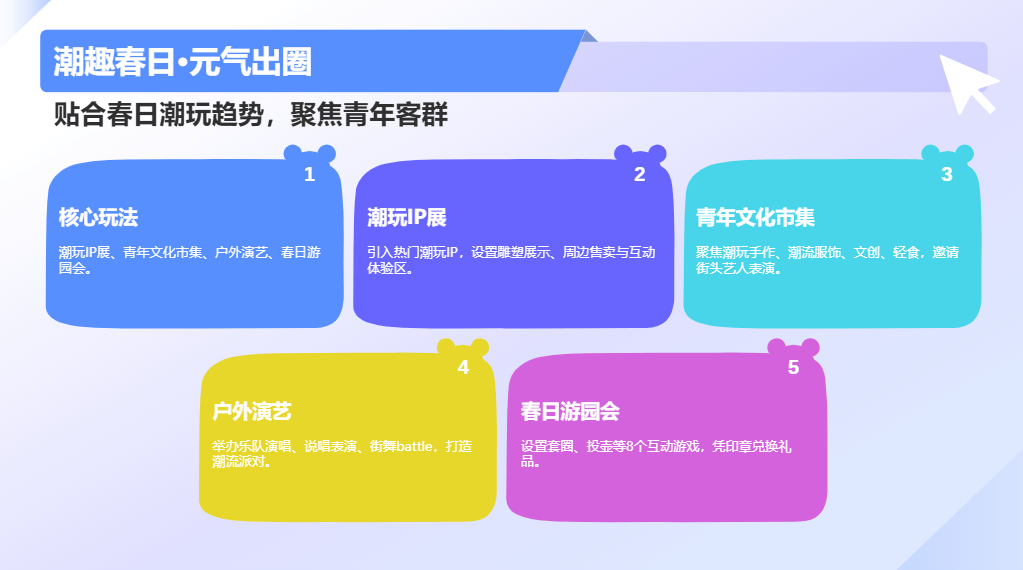 核心玩法:潮玩IP展览、青年文化市集、户外演艺、春日游园会、小众艺术快闪
