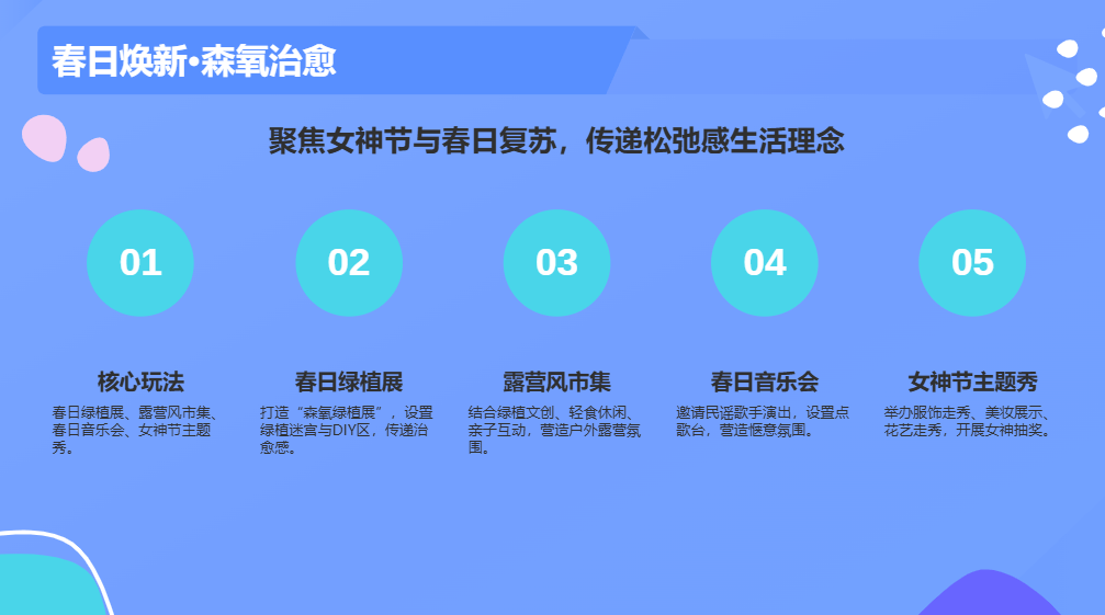 活动目的:借春日复苏契机,打造森系治愈场景,聚焦女神节女性客群,兼顾家庭、年轻客群,传递“松弛感”生活理念,带动美妆、服饰、餐饮、亲子品类消费。