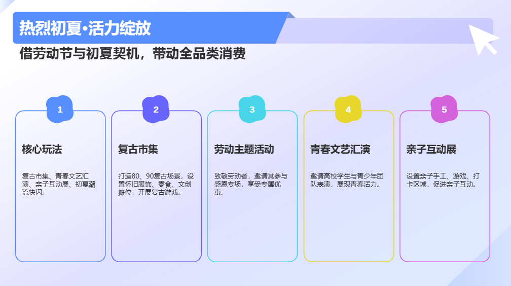 核心玩法:复古市集、青春文艺汇演、亲子互动展、初夏潮流快闪、劳动主题活动