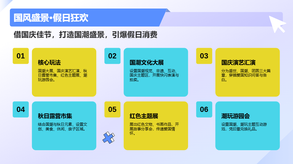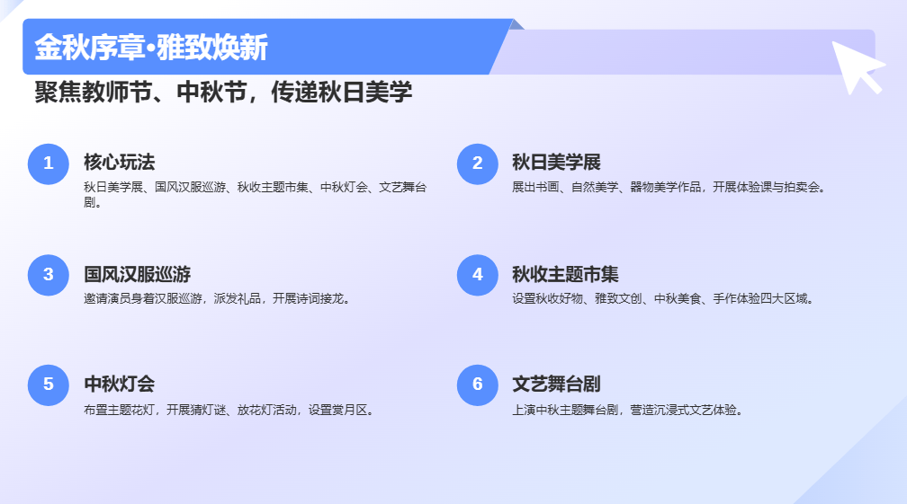核心玩法:秋日美学展、国风汉服巡游、秋收主题市集、中秋灯会、文艺舞台剧