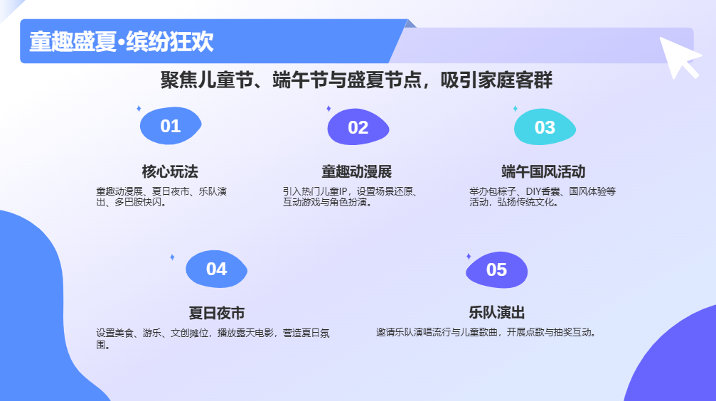 活动目的:聚焦儿童、家庭客群,结合儿童节、端午节双节点,打造童趣、缤纷的活动场景,兼顾国风与潮流,提升家庭客群粘性,带动亲子、餐饮、零售消费。