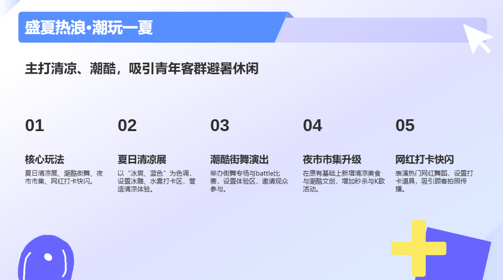 核心玩法:夏日清凉展、潮酷街舞演出、夜市市集、网红打卡快闪、潮流艺术展
