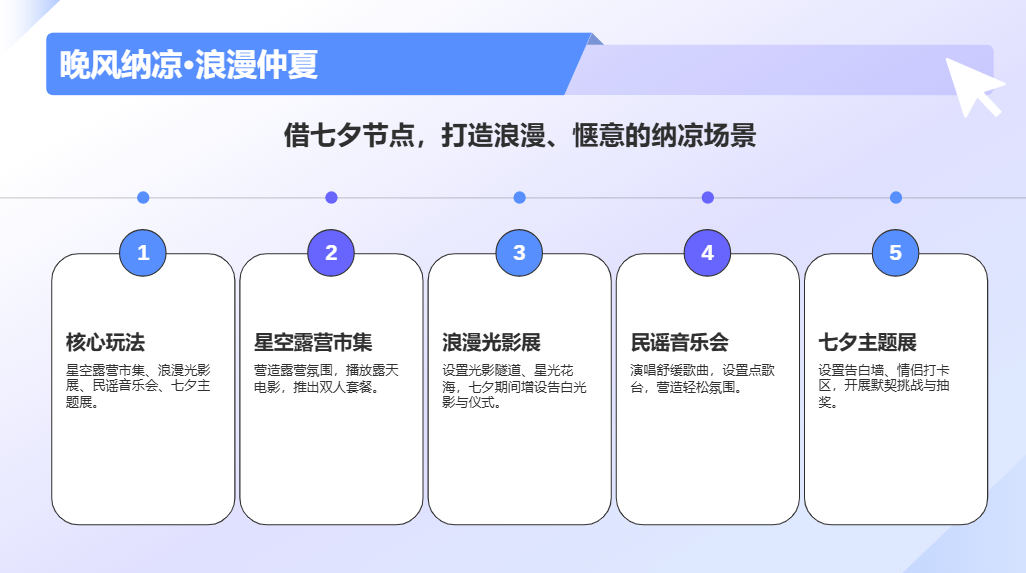 活动目的:借七夕浪漫节点、仲夏纳凉契机,打造浪漫、惬意的活动场景,兼顾情侣、家庭、青年客群,通过星空露营、光影展、民谣演出,提升商业体浪漫氛围,带动餐饮、珠宝、美妆消费。